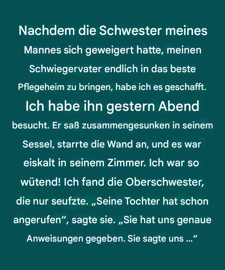 Ich war es, die es schließlich schaffte, meinen Schwiegervater in ein erstklassiges Pflegeheim zu bringen – nachdem die Schwester meines verstorbenen Mannes sich kategorisch geweigert hatte, zu helfen.