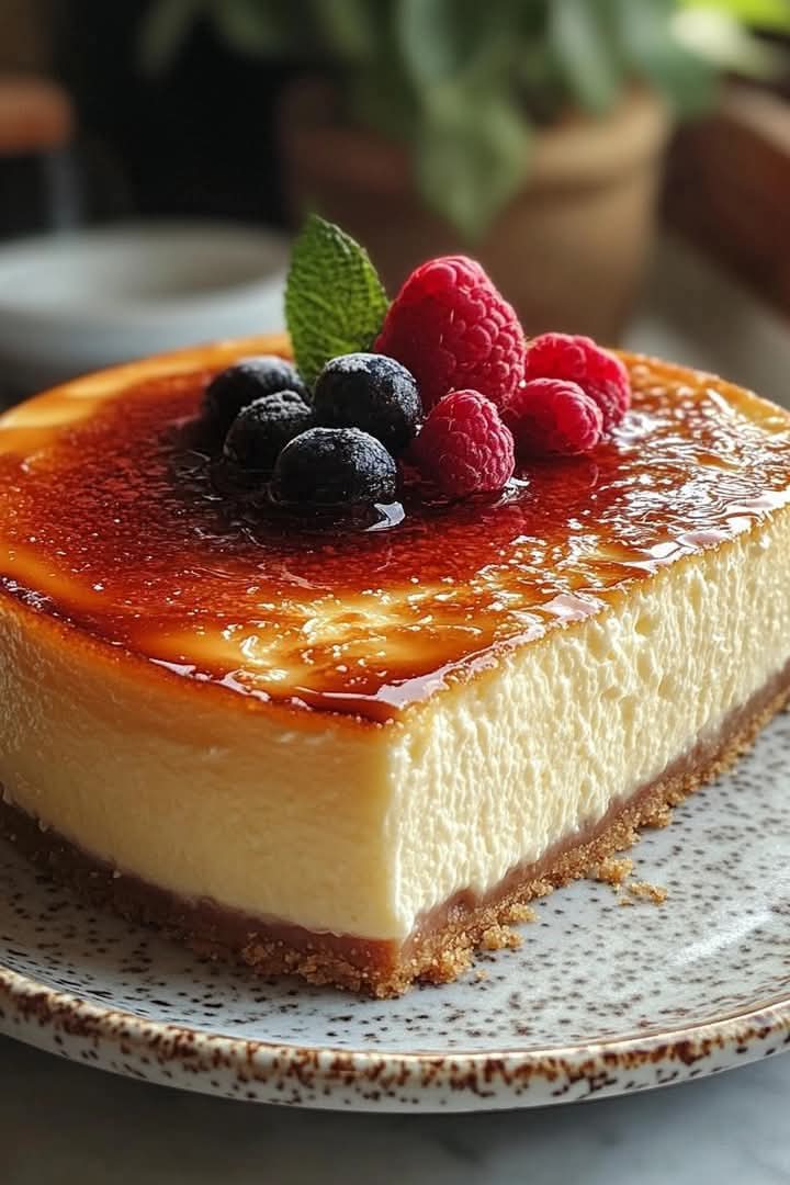 Eine luxuriöse Fusion aus klassischer Crème Brûlée und cremigem Cheesecake – perfekt für ein dekadentes Dessert-Erlebnis!