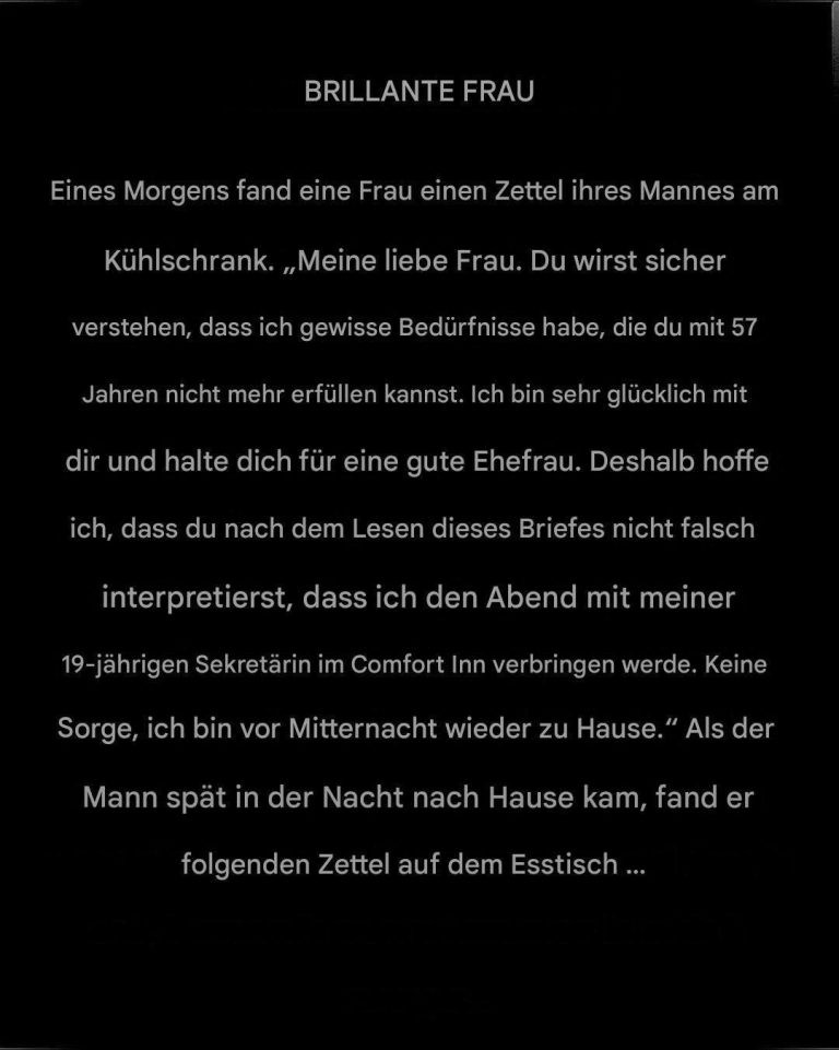Meine liebe Frau, du wirst sicherlich verstehen, dass ich mit 57 Jahren gewisse Bedürfnisse habe, die du nicht mehr erfüllen kannst. Ich bin sehr glücklich mit dir und schätze dich als gute Ehefrau.