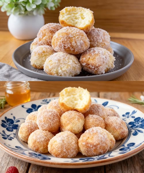 3. Bei 180 °C ca. 10–12 Minuten backen, bis sie goldbraun sind. Fertige Bällchen in Zimt-Zucker wälzen und servieren.