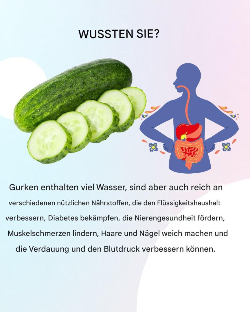 Mit einem Wassergehalt von etwa 96 % ist die Gurke ideal für einen ausreichenden Flüssigkeitshaushalt, insbesondere bei heißem Wetter oder nach dem Sport. Sie ist außerdem kalorienarm und ballaststoffreich und somit eine ausgezeichnete Wahl für alle, die ihr Gewicht kontrollieren oder ihre Verdauung verbessern möchten.