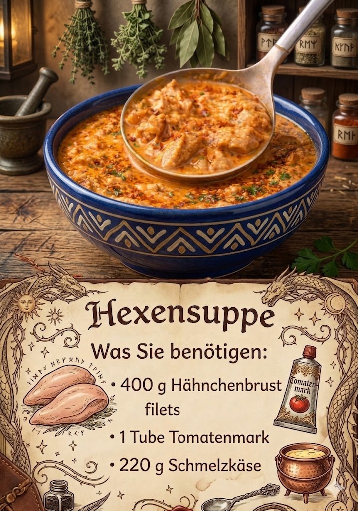 Dieses Rezept ist das gleiche wie das Brot, die Sahne ist Tomatensuppe mit dem Schmelzkäse, die Namen „Hexensuppe“ verdient: sättigend, würzig, mit Tomatenmark und etwas Schärfe (Paprikapulver), aber durch den Schmelzkäse mild und cremig. Wir müssen also mehr Geld bezahlen, damit wir sagen können: „Magie im Topf“ schmeckt.