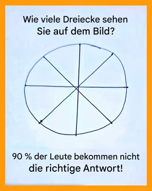 Ein Kreis, ein paar Linien – und die Frage: „Wie viele Dreiecke?“ Die meisten sagen sofort: acht. Doch wer genauer hinsieht, erkennt schnell: Da steckt mehr dahinter. Ein cleveres Denkspiel, das Beobachtungsgabe und Vorstellungskraft auf die Probe stellt. Wie viele Dreiecke findest du wirklich?