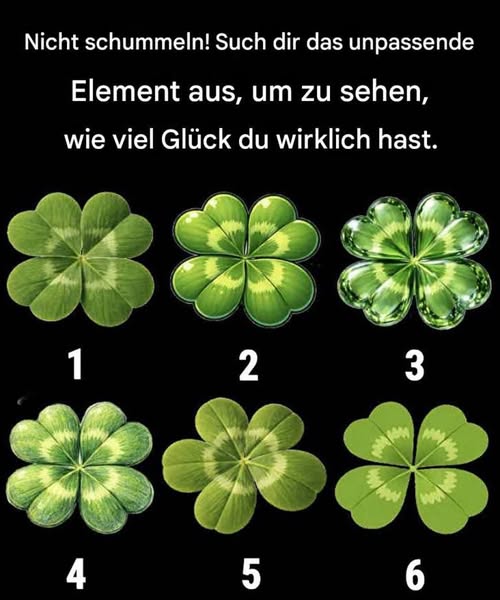 Auf den ersten Blick wirkt das Bild wie ein simples Spiel: sechs Kleeblätter, jedes ein wenig anders, und eine Aufgabe – das unpassende Kleeblatt zu finden. Doch hinter diesem spielerischen Test verbirgt sich etwas viel Faszinierenderes. Es geht nicht wirklich um Glück … sondern um Wahrnehmung, Intuition und Persönlichkeit.