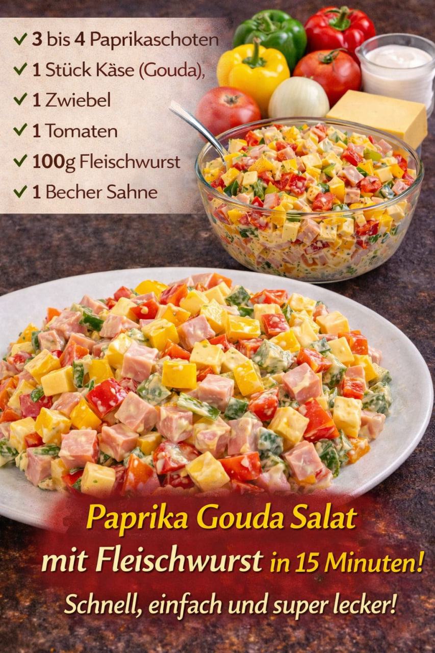 Danach den Gouda ebenso wie die Paprika würfeln (Menge je nach Bedarf) und zusammen mit der Paprika in eine Schüssel geben.