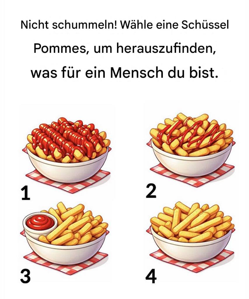 Auf den ersten Blick sieht es nur nach einer Schüssel Pommes aus. Doch Entscheidungen – besonders einfache – spiegeln oft subtile Persönlichkeitsmerkmale wider. Das Bild fordert dich heraus: „Schummel nicht. Wähle eine Schüssel Pommes und finde heraus, was für ein Mensch du bist.“